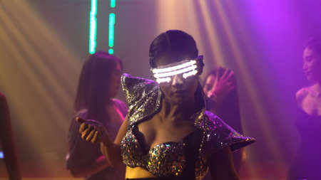 Confident woman wearing LED-style visor and neon mesh fashion posing under bright colored lighting in a club-like futuristic setting with bold attitude.