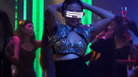 Diverse happy people moving to lively music with neon light at studio. Attractive hipster dancing while asian man show energetic movement while multicultural team cheering and supporting. Regalement.
