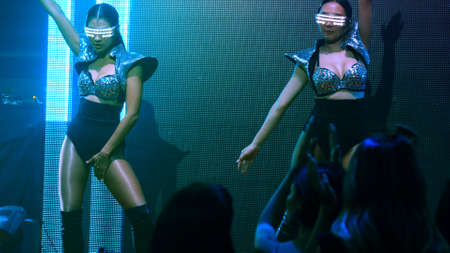 Group of people dance in disco night club to the beat of music from DJ on stage . New year night party and nightlife concept .