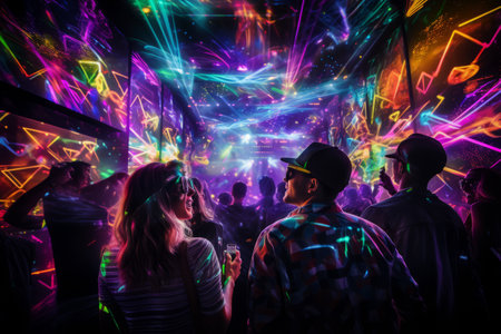 Colorful rave party with neon lights and pulsating music