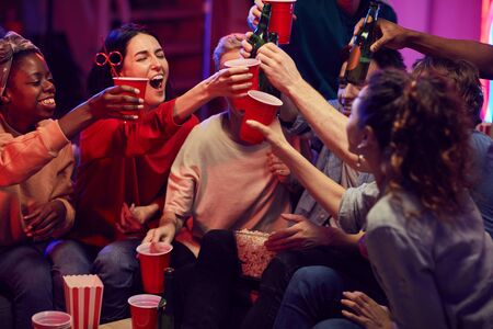 Group of happy friends toasting with alcohol drinks while sitting on sofa they celebrating their meeting