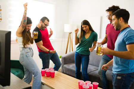 Fun excited friends playing a drinking game at a party and cheering while hanging out in the living room
