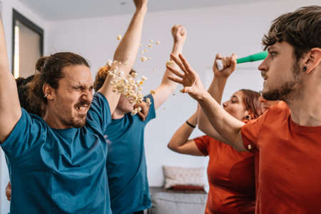 friends celebrating a sports championship on TV. losing team throws popcorn at the winning team. e-sports. soccer.