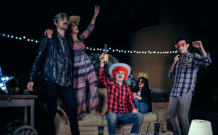 Group of happy young friends having fun with costumes and atrezzo in a outdoors party. Friendship and celebrations concept.