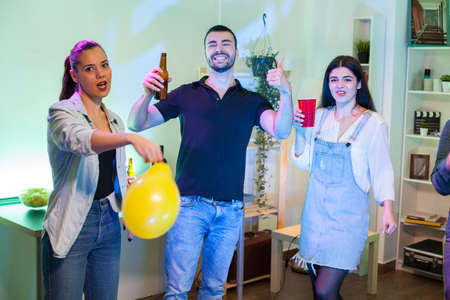 Group of young excited people with drinks having fun with friends at the party