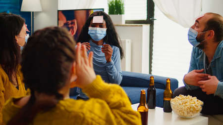 Mixed race of people with sticky notes on foreheads playing name game having fun with beer and popcorn keeping social distancing. with a face mask to prevent spread in home living room.