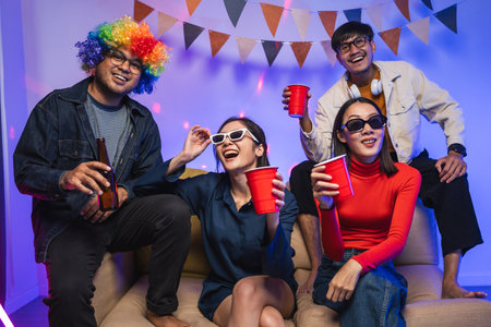 New Year's Party. Group of asian friend party in the house with disco light having fun and dancing together. Enjoy Singing karaoke listening music drinking beer celebration in new year happy hour.