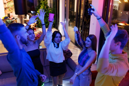 Gathering of young people dancing in an apartment celebrating their friendship.
