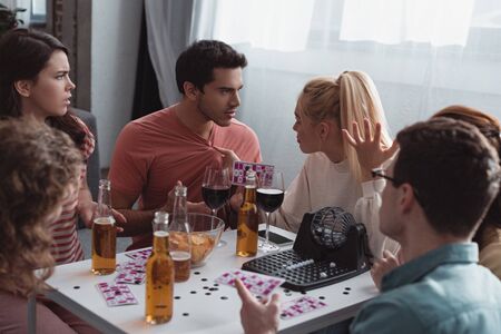 KYIV, UKRAINE - JANUARY 27, 2020: angry girl touching t-shirt of displeased man while playing lotto game with friends