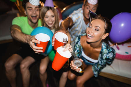 Selective focus of young friends in party caps clinking with beer and disposable cups at night