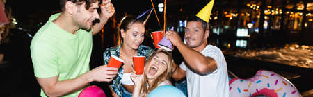 Panoramic shot of friends holding disposable cups during party near swimming pool at night