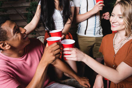 joyful multicultural friends toasting with plastic cups during summer party