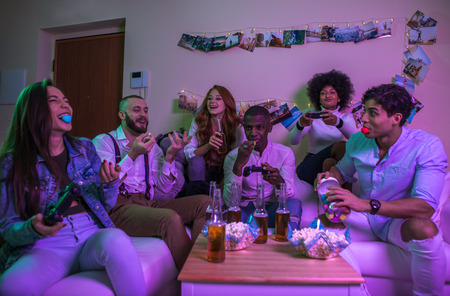 Cheeful young friends having fun spending leisure time together at home, playing video games