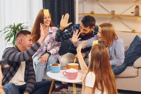 Group of young friends with stickers on their foreheads playing the game on sofa during dining party at home