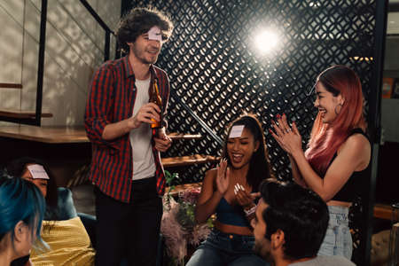 Group of male and female happy friends drinking beer and playing game guess who while having fun at home during housewarming party and reunion
