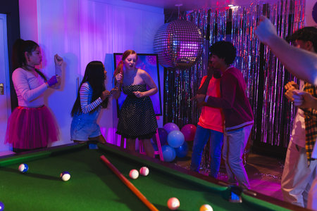 Teenagers dancing and enjoying party near pool table with disco ball lights. nightlife, celebration, fun, billiards, vibrant, youth