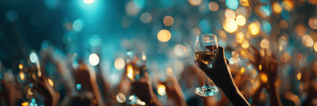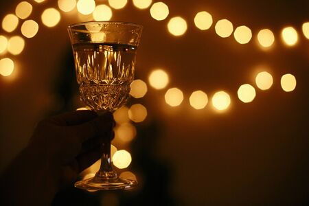 Hand holding champagne glass on background of golden christmas lights, celebrating and toasting in dark festive room. Space for text. Happy New Year eve party. Happy Holidays