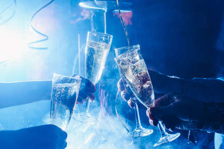 Party and holiday celebration concept. Glasses with champagne in hands. with festive ribbons from the side view in the haze close up
