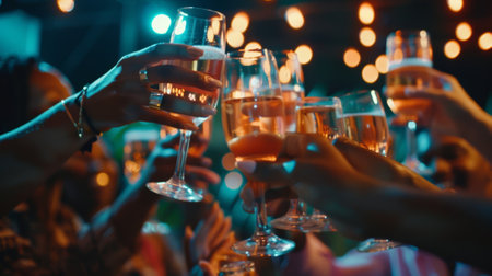 Participants at a lively gathering toast with glasses raised high, creating a joyful atmosphere filled with shimmering lights.