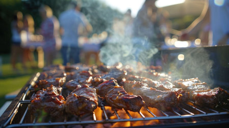 Sizzling pieces of meat are cooking on a barbecue grill, with steam rising into the warm evening air as the sun sets, creating a joyful atmosphere among friends and family.