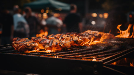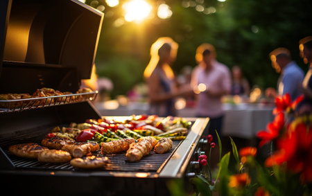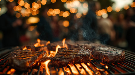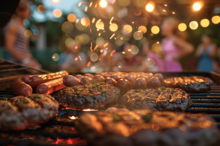 Grilled burgers and hot dogs sizzle on a barbecue, creating a smoky aroma. festive string lights illuminate the scene, while friends enjoy the gathering in the background, celebrating a warm summer evening with laughter and good company.