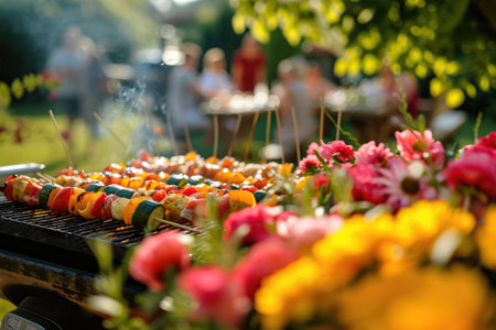 A joyful family enjoys a barbecue in their garden, grilling tasty skewers while basking in the warm sun. Laughter and conversation fill the air as they cherish the moment.