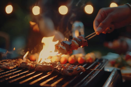 Hand wearing a glove cooking delicious shish kebabs with smoke rising from the grill during a backyard barbecue gathering with friends enjoying an outdoor summer party at sunset