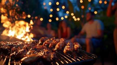Grilled chicken wings sizzling on barbecue with friends enjoying a summer evening outdoors