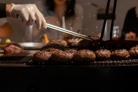 Hamburg, a patty of ground beef, on the charcoal grill in the restaurant