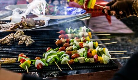 Grilling chicken meat skewers and skebab with vegetables on barbeque charcoal grill
