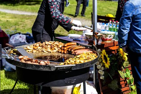 Grilling tasty food on barbecue. Steak, sausages on grill at food festival