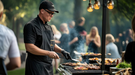 A joyful man grilling barbecue in a sunny outdoor setting, showcasing delicious food and a vibrant atmosphere.