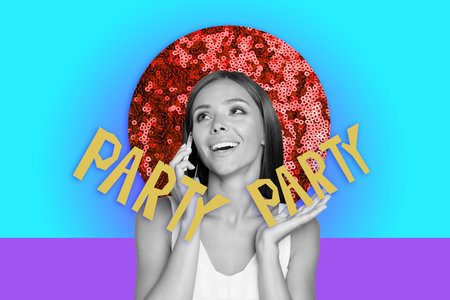 Collage of funny guy girl with obsolete disco ball telephone boombox over sequins in vibrant retro party dance scene