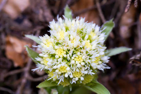 White Butterbur Flower in the Black Forrest of Germany, Europe. Wild Petasites albus. Lovely colors. Soft Bokeh. Early Spring Flower. Macro with very shallow depth of field