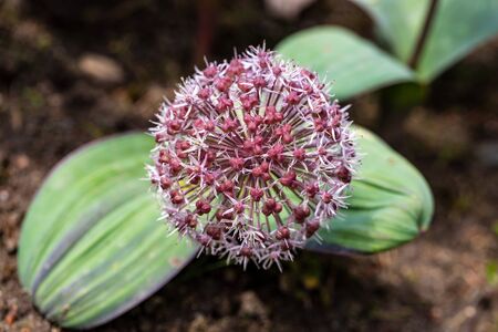 Its early spring and this giant onion plant is near bloom. A view from above as it blooms. Allium giganteum Regel