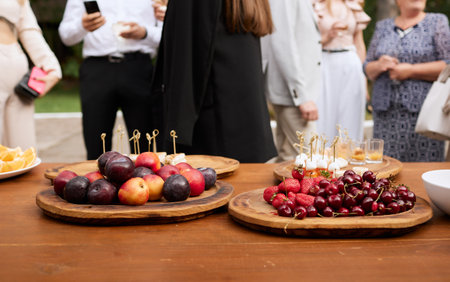 Snacks on the wedding table with fruits, meat on skewers with cheese, red caviar light background on a plate