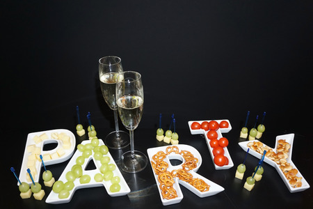 snacks and chips for a party on black background