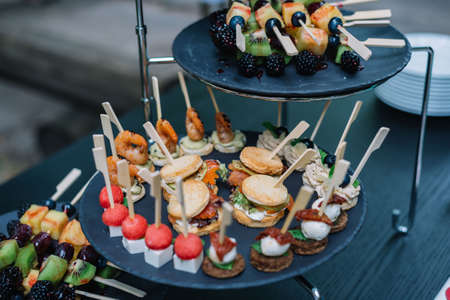 Appetizers on plates. catering service. wedding welcome food. Fruits on skewers (blueberries, kiwi, pineapple) and canapes (shrimp, mozzarella, sun-dried tomatoes). Welcome buffet at the event.