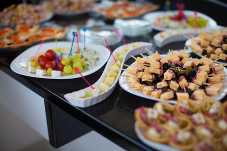 a lot of cold snacks on buffet table, catering