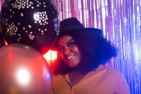 Young black woman looks happy while spend time in night club. Birthday party and nightlife concept.