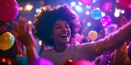 A joyful young woman with curly hair enjoying a lively party surrounded by colorful balloons