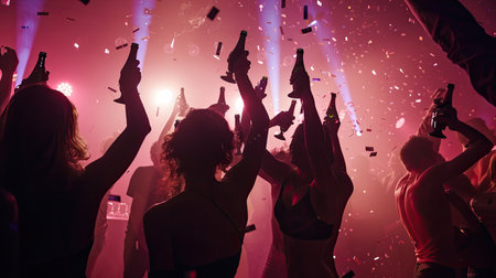 Party silhouettes: young people with raised flutes, clubbing scene