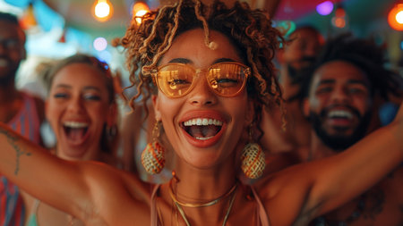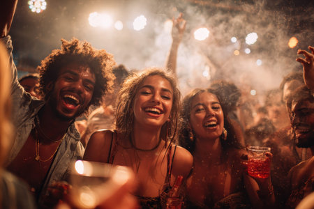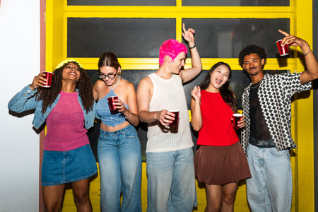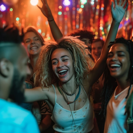 Joyful gathering of young multiethnic people enjoying a lively party filled with laughter and music in a vibrant nightlife setting