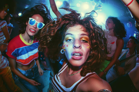 A bright and energetic photo of people dancing in a club. The scene captures their joyful expressions as they dance to the music at a disco. The atmosphere is filled with energy and excitement, showing a variety of characters enjoying a nightclub party.