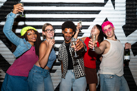 Group of young girls and boys friends celebrate New Year's Eve with drinking glasses with Generative AI