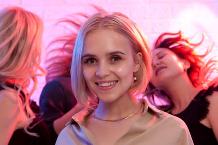 Blonde woman looking at camera while dancing at nightclub among her friends