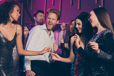 Photo of friends company relaxing in night club laughing joking wearing festive fashionable clothes dancing together on floor with neon lights