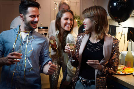 Group of cheerful young people have party and celebrating new year indoors.
