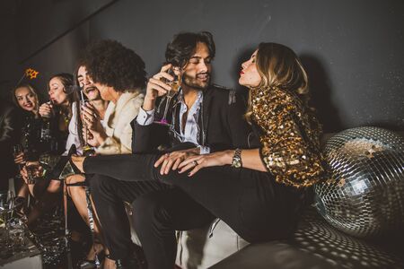A cheerful group of friends enjoy new year party at nightclub People are drinking, dancing and having a good time at the party comeliness.