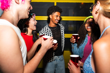 positive multiracial friends in colorful clothes drinking from plastic cups in night club on black background